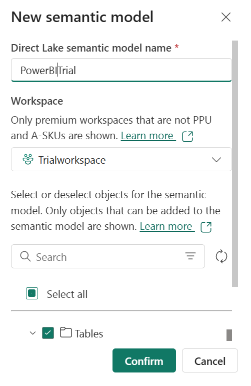 • In this dialog, choose the tables you wish to include and specify the workspace where you want to save the semantic model.