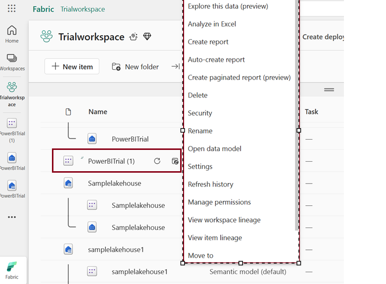 • Within the workspace view, hover over the semantic model’s name PowerBITrial. Click on the ellipses (…) à “Auto-create report” option.