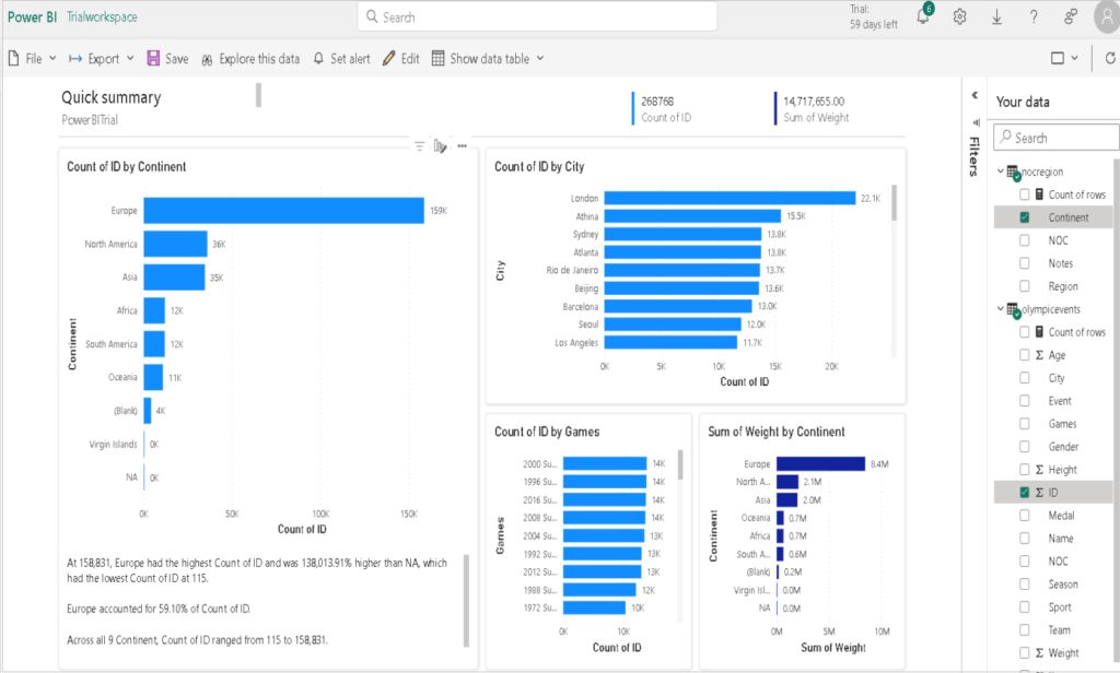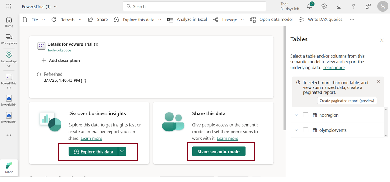 • It showcases details about the semantic model, including its location, the date of the last refresh. You also have the option to explore the data further and share it with others.