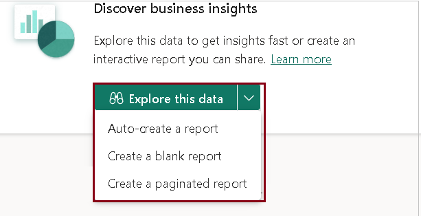 • Under the “Explore this data” section, you will find various options such as ‘Auto-create report’, ’Create a blank report’, and ‘Create paginated report’.