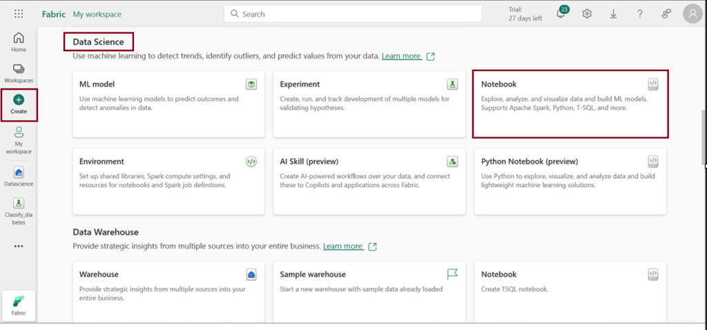 • On Fabric Homepage ,Navigate to the create option on the navigation bar on the left and click on Notebook under “Data science” section.