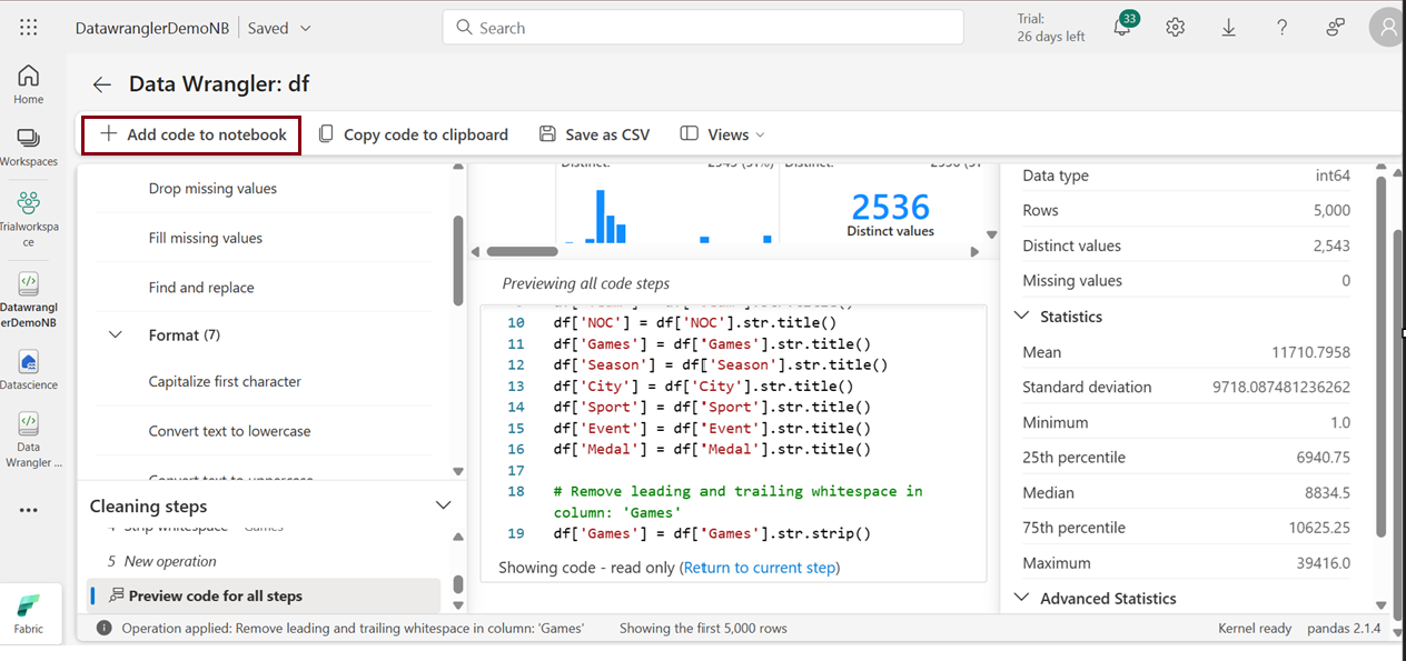 Lesson 36 – Data Wrangler in Microsoft Fabric