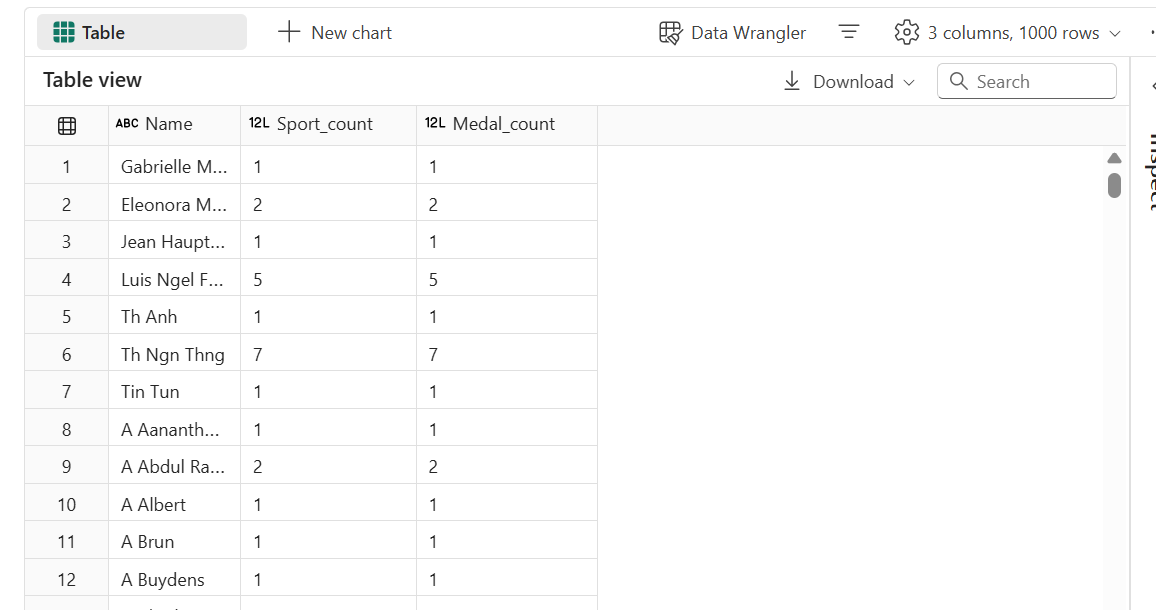 To understand the count of medals and sports for each individual, utilize Data Wrangler to execute a group-by operation.