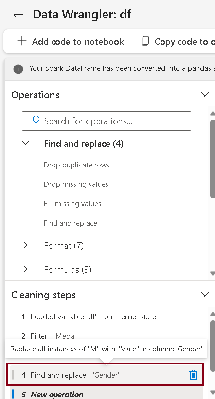 • Navigate to Data Wrangler, Cleaning steps pane.