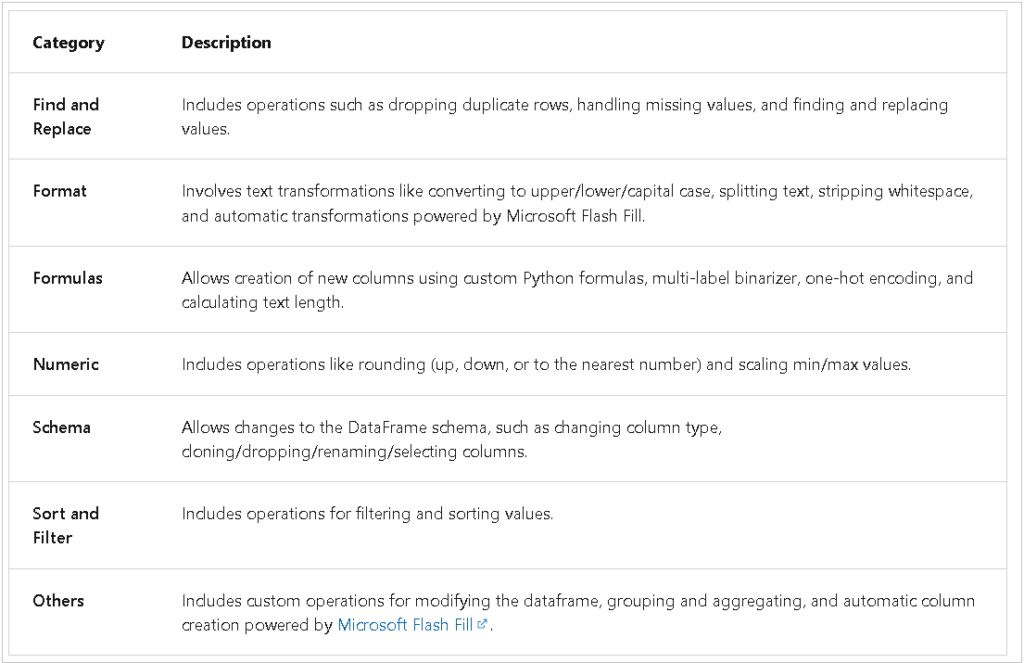 • Presently, these are the available categories of operators within Data Wrangler.