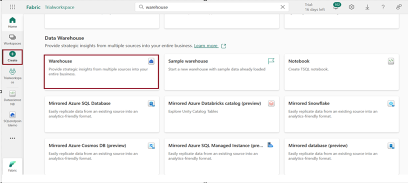 - Click on “Create” from navigation pane on the left and choose warehouse under “Data warehouse” to create a warehouse environment.