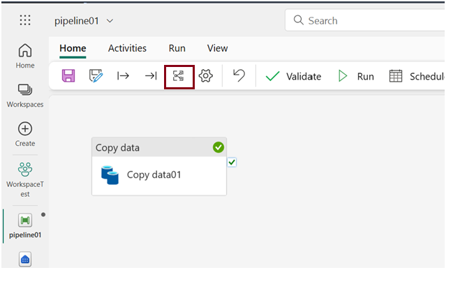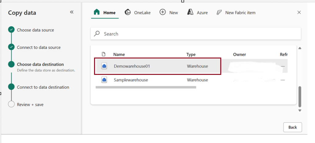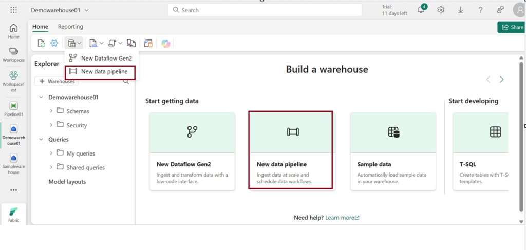After creating a warehouse in your preferred workspace, click on “New Data Pipeline” on the warehouse homepage, or Under “Home” tab, choose “New Data Pipeline.