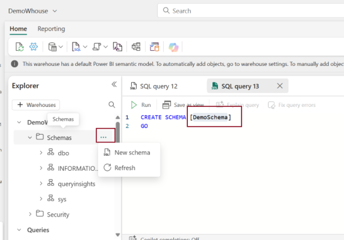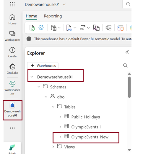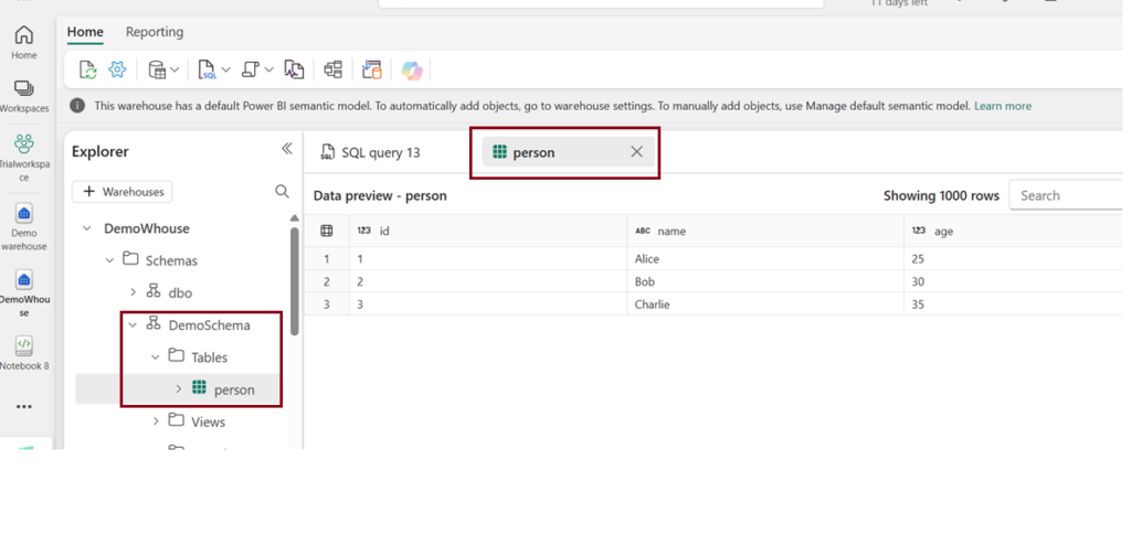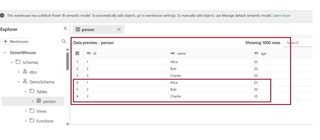 After executing the above code, a new table named “Person” was created in the warehouse, and within the ‘DemoSchema’.