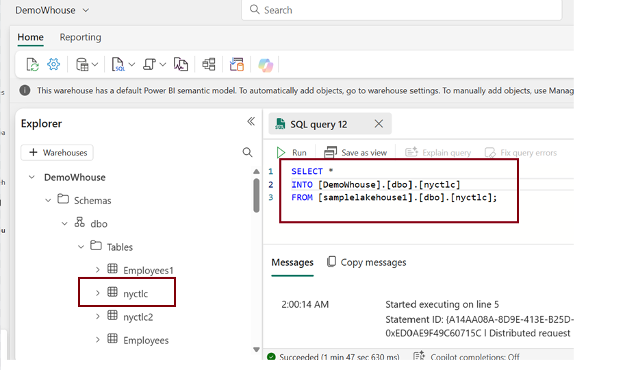 Here I copied a table “nyctlc” which is the sample data loaded in Lakehouse to warehouse using basic T-SQL query.