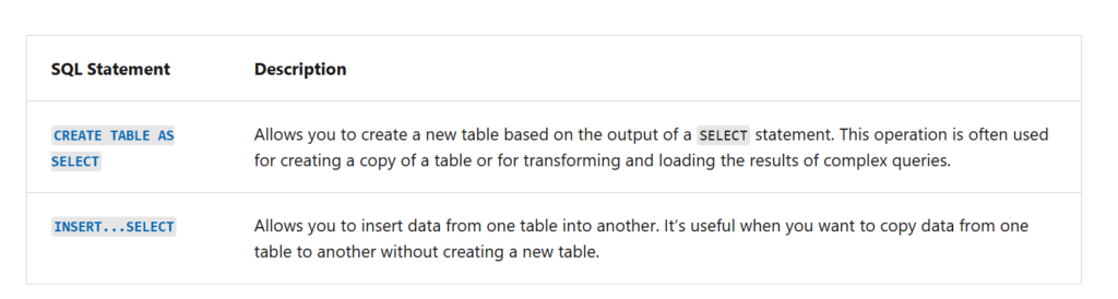 You can load data from other warehouses and lakehouses within the same workspace by using CREATE TABLE AS SELECT (CTAS) or INSERT…SELECT statements