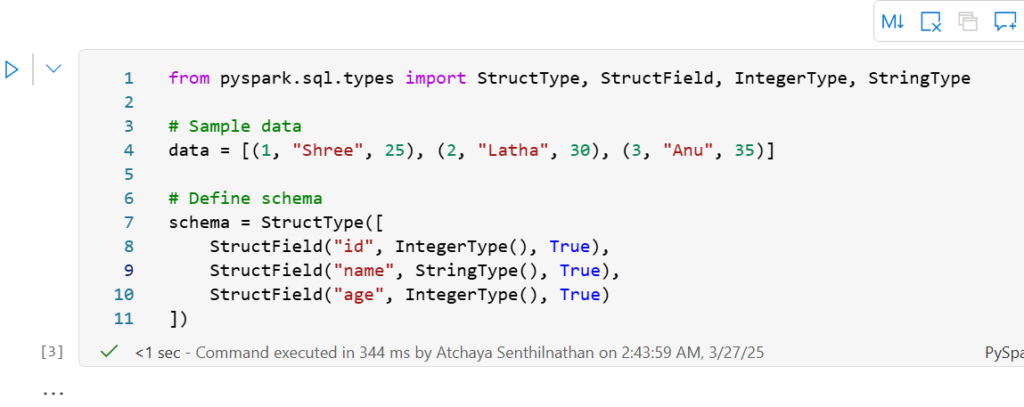 Here we are creating a sample DataFrame in PySpark and defining the data and the schema for the DataFrame.