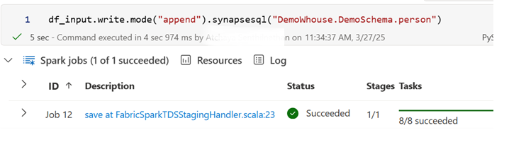 df_input.write.mode("append"). synapsesql("DemoWhouse.DemoSchema.person")