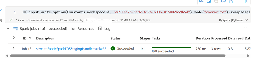 df_input.write.option(Constants.WorkspaceId, "e6977e75-5ed7-4176-b99b-015882a59b5d").mode("overwrite").synapsesql("Demo warehouse.dbo.person")