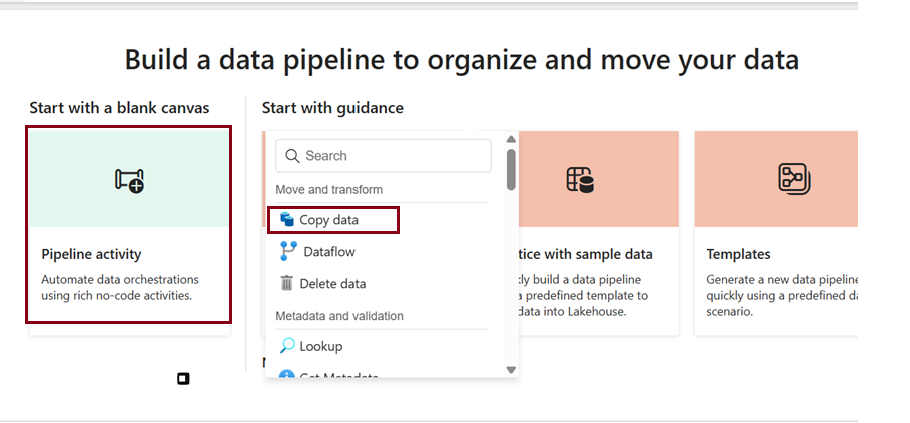 Once you create a pipeline to load data into a warehouse, you will see the below page. Here click on Pipeline activity and choose “Copy data”
