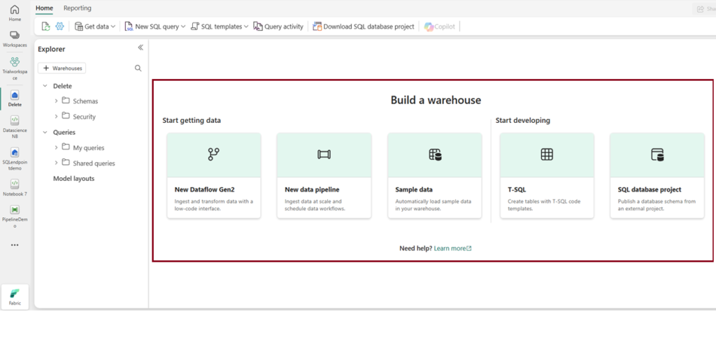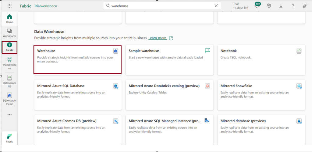 2. Click on “Create” from navigation pane on the left and choose warehouse under “Data warehouse” to create a warehouse environment.