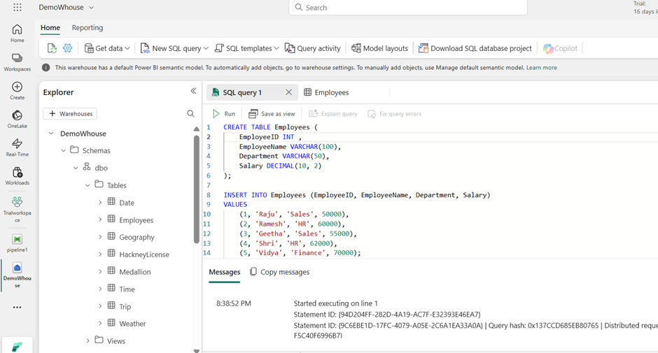 I created a sample Employee table using an SQL query in the warehouse and demonstrated the implementation of RLS, CLS, and Dynamic data Masking.